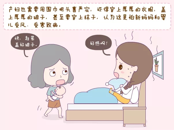 老人们会建议新妈妈,产后千万不要见风,即便是夏天也要把门窗紧闭,而且要新妈妈穿长衣长裤穿袜子,更严重的还有可能让新妈妈盖着被子捂着。产后,是不能见风,这种方式只是不能直接吹到新妈妈,而不是让屋内门窗紧闭不通风。室内空气浑浊,开窗通风有利于新鲜空气进来。即便是冬季睡觉的时候,窗户最好也留个缝隙。夏季炎热,新妈妈和宝宝都怕热,可以开空调降温,只要不直接吹到身上就行。