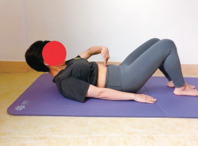 如图所示,平躺、屈髋屈膝,自己用手指沿腹中线触诊腹部的腹直肌间距。触诊时抬起头部至肩胛骨离床,感觉手指下腹直肌的间距大小。超过2指即为腹直肌分离。